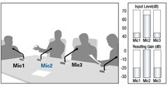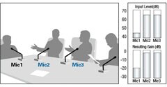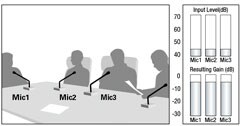 Если два человека говорят одновременно, распределение усиления между активными микрофонами регулируется соответствующим образом, чтобы обеспечить постоянное общее усиление. При этом усиление остальных микрофонов уменьшается.