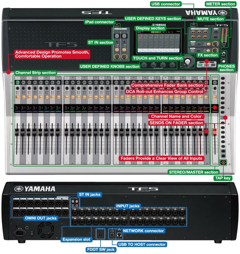 При разработке серии TF инженеры компании Yamaha заимствовали органы управления у своих существующих высококачественных микшеров, добавив интуитивно понятный интерфейс, который был оптимизирован для сенсорной панели управления. Почти все возможные операции осуществляются с помощью только одной сенсорной панели, которая уже стала визитной карточкой цифровых микшерных консолей Yamaha. Одним словом, инновационный интерфейс серии TF быстро станет вторым домом для широкого круга пользователей. Не важно, если у вас есть опыт работы с цифровыми консолями Yamaha, работаете ли вы с другими цифровыми консолями, приветствуете только аналоговые микшерные пульты или никогда не работали с ними вовсе, – консоли серии TF быстро приведут вас к желаемым результатам, благодаря простому, но эффективному рабочему процессу. А наличие органов физического контроля, окружающих сенсорную панель, повышают удобство и точность управления.