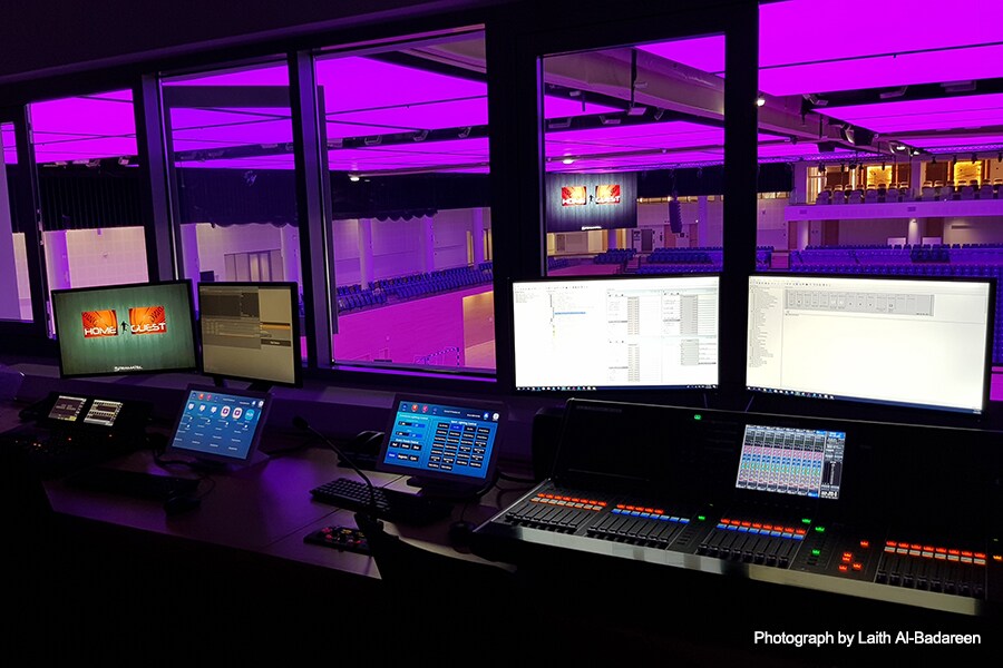 Для мероприятий в зале также установлены цифровые микшерные консоли Yamaha CL5 и CL3 с тремя рэковыми модулями ввода-вывода Rio1608-D2. Оптоволоконные линии от пункта управления к более чем 50 точкам доступа по всему зданию QUSEC позволяют легко подключать оборудование и работать из любой части здания.