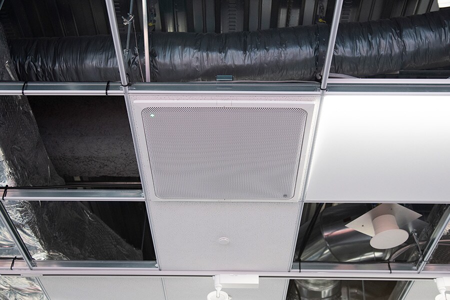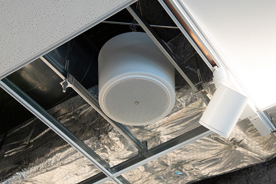 Открытое пространство для инноваций, где динамики и микрофон ADECIA установлены на потолке.