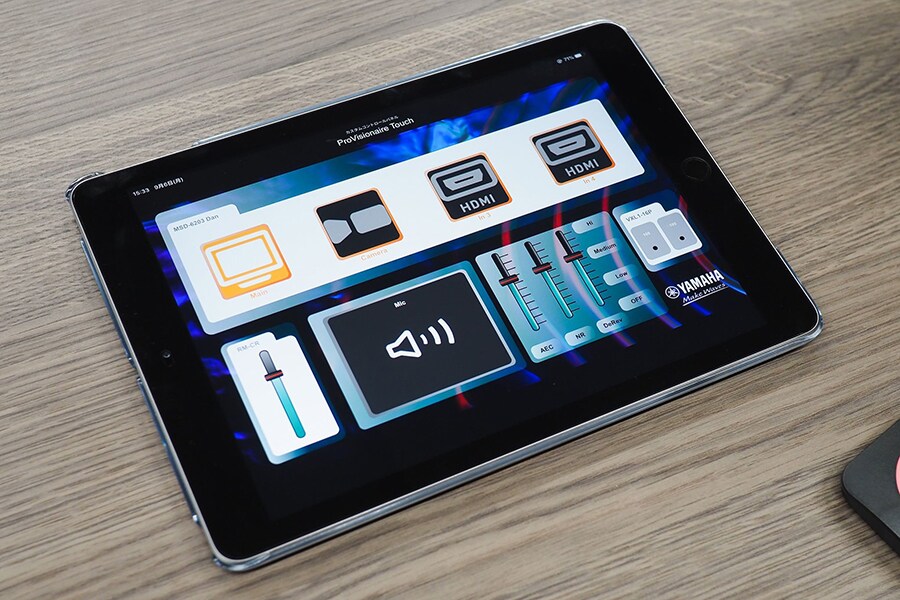 Юсуке Тойоура: конференц-процессор системы ADECIA поддерживает ProVisionaire, это приложение для удаленного управления и наблюдения за системой. Например, при беспроводном подключении через ClickShare, даже если главного компьютера под рукой нет, этот iPad позволяет вручную заглушить микрофон. Также с его помощью можно изменять громкость либо переключаться между каналами видео во время конференций. Еще можно вести воспроизведение через плеер Blu-ray, который поддерживает технологию Yamaha MusicCast. ProVisionaire также позволяет совершенно свободно настраивать рабочий экран, как при работе с элементами в PowerPoint.