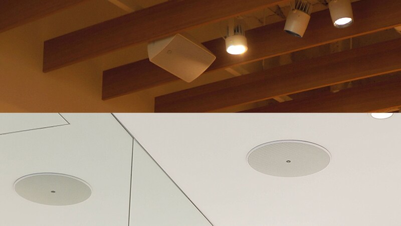 Два типа акустических систем, потолочные громкоговорители и акустические системы поверхностного монтажа, которые устанавливаются на стены или потолок, как правило, используются для увеличения эффективности работы магазинов и других помещений для торговли и обслуживания. Обычные АС для жилых помещений сложно установить так, чтобы они удовлетворяли требованиям, характерным для коммерческих помещений. Обычно потолочные громкоговорители используются для того, чтобы наличие АС было менее заметным, а АС поверхностного монтажа используются на тех объектах, где нет потолочных панелей, или чтобы сделать АС более заметной частью дизайна интерьера. В магазинах с низкими потолками рекомендуем использовать АС поверхностного монтажа, которые проще направить на определенные участки помещения, которые нужно озвучить. Для магазинов с высокими потолками также хорошо подходят АС подвесного типа, которые свешиваются с потолка. При выборе АС также учитывайте ограничения, связанные с местом установки, и выбирайте модели, соответствующие вашим собственным требованиям к проектированию или строительным нормам.