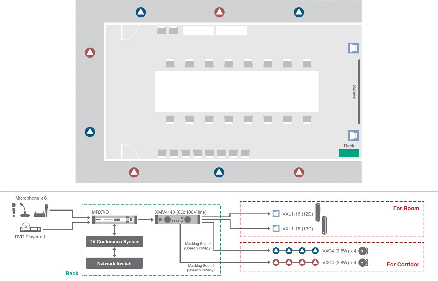 Эти возможности крайне необходимы в современных офисах, финансовых учреждениях, медицинских учреждениях и т.п. Описанная здесь система — хорошее начало. Хотя удаленные конференции — это быстро развивающийся способ общения, эхо из-за обратной связи и иные нарушения разборчивости все еще являются распространенной проблемой. Усовершенствованная модель Yamaha MRX7-D оснащена функцией Acoustic Echo Canceller, которая эффективно подавляет эхо, даже если микрофоны в помещении улавливают выходной сигнал акустической системы. Таким образом устраняются эхо и пропадания звука в обоих направлениях. Добавив тонкие линейные массивы VXL1, которые обеспечивают исключительную четкость звука, можно получить систему, которая обеспечит отличную разборчивость для приятного общения. MRX7-D также включает функцию обеспечения конфиденциальности разговоров (Speech Privacy), которая подает специальный маскирующий сигнал на акустические системы, установленные в коридоре за пределами конференц-зала, чтобы посторонние не могли подслушать разговоры в нем.