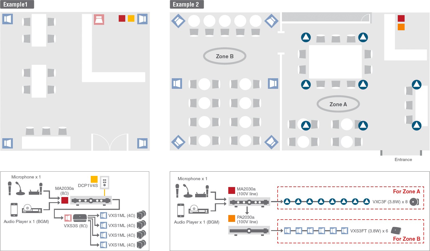 Для такой ситуации есть идеальное решение, подходящее для небольшого кафе или ресторана, которое мы рекомендуем нашим клиентам. Чтобы создать комфортную, приятную среду, нужно уделить внимание как подбору звуковых характеристик оборудования, так и его внешнему виду. Компактные громкоговорители, такие как VXS1ML и VXS3F, можно прикрепить на стены или потолок. Их изящные очертания сделают любой декор более элегантным. Они специально настроены таким образом, чтобы передавать все заложенные в музыке нюансы и сохранить ее выразительность даже на низкой громкости. С их помощью музыка в полной мере оказывает свой вклад в создание атмосферы заведения. MA2030a — это стильный микшерный усилитель, который легко использовать даже без какого-либо предшествующего опыта работы с аудиооборудованием. Вам понадобится лишь MA2030a, громкоговорители серии VXS и любой источник музыки. При необходимости в эту систему можно добавить микрофон для голосовых оповещений и проведения небольших мероприятий, что позволит вам легко расширить сферу деятельности. См. пример 1. Вы можете увеличить количество поддерживаемых системой громкоговорителей, добавив усилитель мощности PA2030a, чтобы озвучить помещение большего размера или более сложной формы. В подобную систему большего масштаба можно добавлять модели VXS3FT и потолочные модели VXC3F в зависимости от особенностей помещения и требований к дизайну интерьера. См. пример 2.
