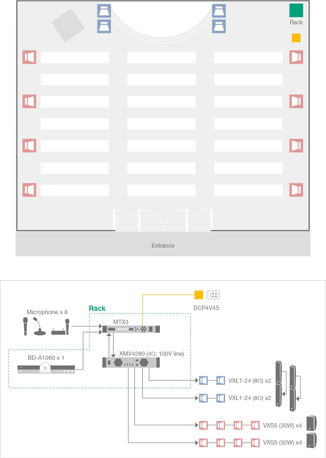 Такой запрос типичен для залов в домах поклонения и некоторых учебных заведениях. В таких условиях тонкие линейные массивы серии VXL являются лучшим выбором в качестве основных передних колонок как по слуховым, так и по визуальным причинам — они обеспечивают чистый и хорошо выраженный звук в помещениях со значительной естественной реверберацией. В примере каждые динамики VXL соединены вертикально попарно. Благодаря этому увеличивается уровень звукового давления и улучшается распространение звука, а это гарантирует, что даже те, кто сидит в задних рядах, будут хорошо слышать звук. Покрытие максимально увеличивается, а мертвые зоны устраняются путем размещения акустических систем VXS5 в левой и правой частях помещения. Такое расположение обеспечивает чистый звук, который одинаково хорошо слышат все присутствующие. Матричный процессор MTX включает функцию подавления обратной связи, которая также полезна в этой ситуации. Нажатием одной кнопки можно загрузить соответствующий набор параметров, предварительно заданный с помощью MTX-MRX Editor и, таким образом, мгновенно настроить систему для централизованного управления. Повседневную регулировку громкости можно удобно выполнять с помощью панелей управления DCP без необходимости работы с процессором MTX.