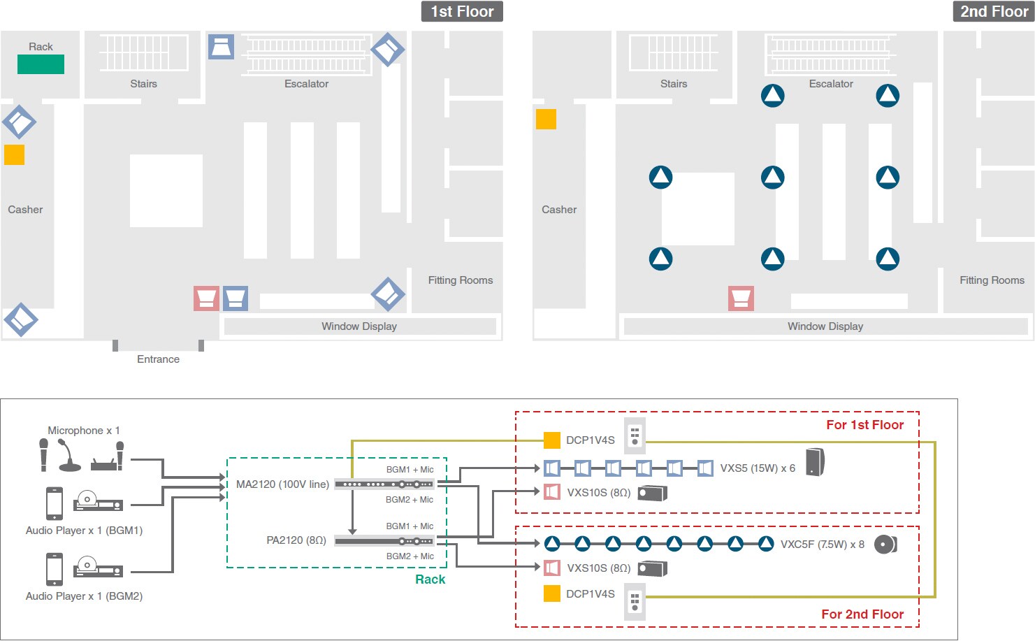 Эта система будет хорошим выбором для многоуровневого бутика или ресторана с баром или лаунж-зоной. Фоновая музыка так же важна для создания определенного настроения, как декор и освещение. Акустические системы Yamaha серий VXS и VXC отличаются высоким качеством воспроизведения, которое обеспечивает полное эмоциональное воздействие музыки в зоне прослушивания, внося существенный вклад в общую атмосферу. Мощность и эффект ритмичной музыки можно повысить, добавив сабвуферы VXS10S. MA2120 будет хорошим выбором для трансляции объявлений или рекламы при одновременной передаче различной фоновой музыки в разные зоны. Этот усилитель включает функцию Ducker, которая автоматически уменьшает громкость фоновой музыки во время использования микрофона, благодаря чему громкость не нужно регулировать вручную. Панели управления DCP1V4S, установленные в отдельных зонах, позволяют дистанционно управлять громкостью фоновой музыки и другими операциями.