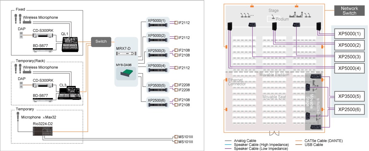 Этот зал можно использовать целиком или разделить перегородками для проведения конференций, семинаров, лекций, дискуссий и других событий, используя сеть Dante для передачи звука. Если зал используется целиком, можно использовать либо цифровую микшерную консоль CL3 в аппаратной, либо цифровую микшерную консоль QL1 в зале. Если зал разделен перегородками, QL1 используется для части со сценой, а CL3 — для другой части.