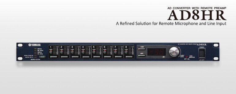 Моделью AD8HR Yamaha открывает новое поколение 8-канальных отдельных микрофонных предусилителей с аналого-цифровым преобразователем с дистанционным управлением в стандартном рэковом корпусе 1U, сочетающими уникальное качество звука со множеством новых функций. AD8HR можно использовать с разными цифровыми консолями Yamaha, такими как PM5D, DM2000 и DM1000, обеспечивая высочайшее качество предусиления сигнала микрофона за счет использования аналоговой схемы, заимствованной из известнейшей аналоговой консоли PM5000. AD8HR поддерживает стандарт цифрового выходного аудиосигнала 24-бита/96-кГц, а цифровой интерфейс позволяет управлять коэффициентом усиления, фильтром и фантомным питанием непосредственно с консоли.