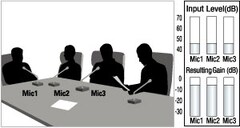 When one person is speaking the gain of the corre sponding microphoneis instantaneously raised to 0 dB while the gain of t he o ther t wo m icrophones is lowered. The same occurs in any channel when only one person is speaking.