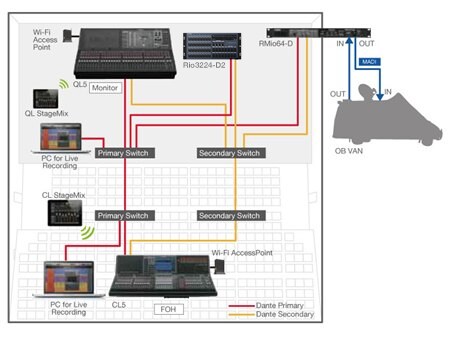 Система обработки живого звука включает в себя FOH микшерную консоль серии CL и микшерную консоль серии QL на сцене. Помимо формирования мониторного микса на консоли QL, функция Port to Port позволяет использовать ее как устройство ввода-вывода с функциональными возможностями примерно на уровне модуля серии R, за счет чего уменьшаются размеры и сложность системы в целом. Модуль RMio64-D преобразует сигнал формата Dante в формат MADI для передачи на передвижную телевизионную станцию за пределами концертной площадки. Предусмотренное в RMio64-D преобразование частоты дискретизации эффективно устраняет проблемы с синхронизацией.