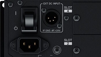 Помимо основного разъема AC IN, на задней панели предусмотрен вход EXT DC INPUT с гнездом типа XLR-4-32 для подключения внешнего источника питания на +24 В пост. тока, который может служить в качестве резервного. Основной разъем питания AC IN оборудован фиксатором (V-Lock), который помогает предотвратить случайное разъединение.
