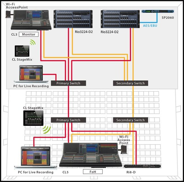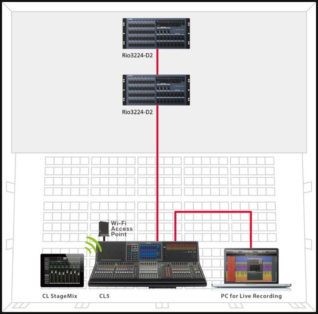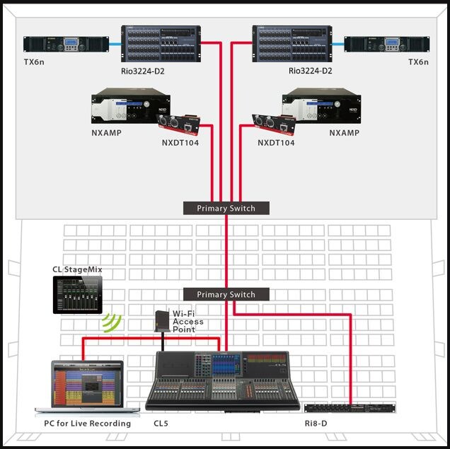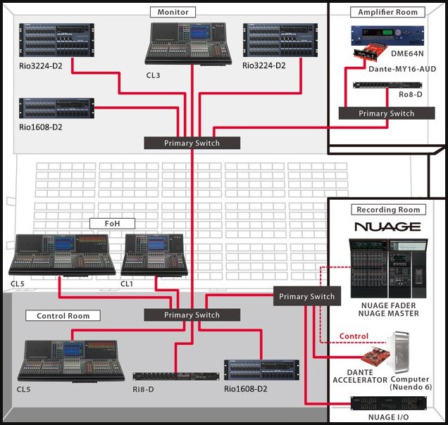 В этом примере система обработки живого звука, состоящая из консолей серии CL и рэк-модулей ввода-вывода серии R, соединена с передовой системой постпроизводства Nuage через протокол Dante. Dante позволяет с удобством реализовать полностью цифровую сетевую аудиосистему данного типа в концертных залах или театрах, где есть помещение для записи. Несмотря на то, что в представленной системе несколько консолей серии CL совместно используют модули ввода-вывода серии R, функция коррекции путем изменения коэффициента усиления гарантирует отсутствие конфликтов по усилению.