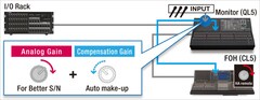 Возможность непосредственной коммутации входных и выходных портов, минуя микширующие каналы, обеспечивает беспрецедентную возможность свободной маршрутизации сигналов между аналоговыми входами и выходами, Dante и слотами MY. Например, консоль QL может быть использована в качестве устройства ввода/вывода для других консолей серии QL или CL, одновременно функционируя и как мониторная консоль . Для использования в качестве и мониторного пульта, и устройства ввода/вывода требуется лишь одна консоль QL, а аналоговый коэффициент усиления может дистанционно регулироваться с FOH-консоли QL или CL. Также можно смешивать аналоговые сигналы, поступившие на консоль, передавая их непосредственно на многоканальную систему записи, например, через Dante. Возможности безграничны!