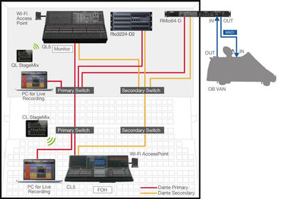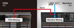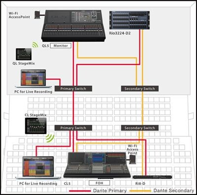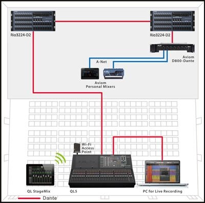 Система обработки живого звука включает в себя микшерную консоль серии CL напротив сцены и микшерную консоль серии QL на стороне сцены. Наряду с мониторным микшированием функция Port to Port сценической консоли QL позволяет ей работать как устройство ввода-вывода с функциональными возможностями примерно на уровне рэк-модуля серии R, за счет чего уменьшаются размеры и сложность системы в целом.