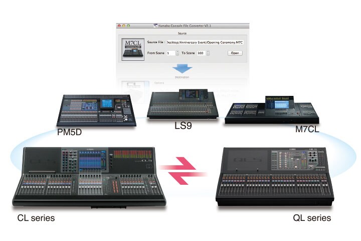 Поскольку сохраненные данные микширования консолей серий QL и CL совместимы, информация, созданная на одной консоли, может считываться и использоваться другой. Таким образом, время и силы, однажды затраченные на настройку параметров миксов, можно использовать в дальнейшем. Более того, программное обеспечение Yamaha Console File Converter гарантирует совместимость с консолями серий CL, PM5D, M7CL и LS9. Все тщательно выстроенные вами данные могут найти себе применение в будущем!