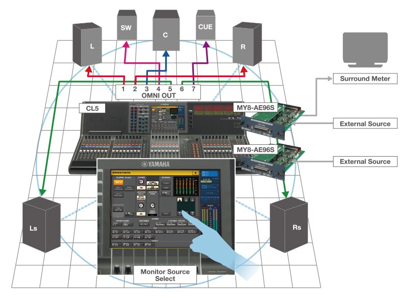 Внешние источники объемного звука подключаются к консоли через слот расширения Mini-YGDAI, чтобы с консоли можно было выполнять их переключение и мониторинг. Сигналы объемного звука могут подаваться и на внешний индикатор уровней сигнала каналов окружающего звучания через слот Mini-YGDAI.