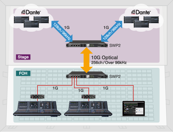 Серия SWP2 оснащена оптическими портами со скоростью передачи данных до 10 Гбит/с, которой более чем достаточно даже для сети Dante с частотой дискретизации 96 кГц. Это масштабируемое решение растет вместе с сетью Dante 96 кГц с большим количеством каналов.