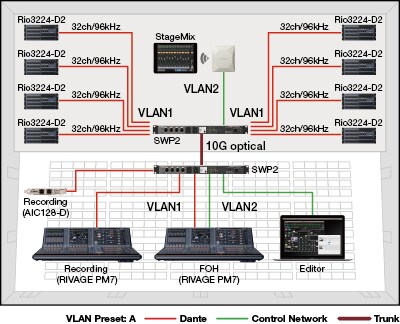 В этом случае используется набор параметров VLAN A, в котором VLAN1 работает с сетью Dante, а в VLAN2 передает управляющие сигналы, например, для Editor или StageMix, связанные с аудиосигналами Dante, что улучшает стабильность сети.