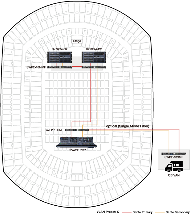 В этом примере на коммутаторах SWP2 установлен набор параметров VLAN C. Primary линия Dante назначена на VLAN1, а Secondary на – VLAN2. Для резервирования кабельных соединений достаточно всего двух коммутаторов.