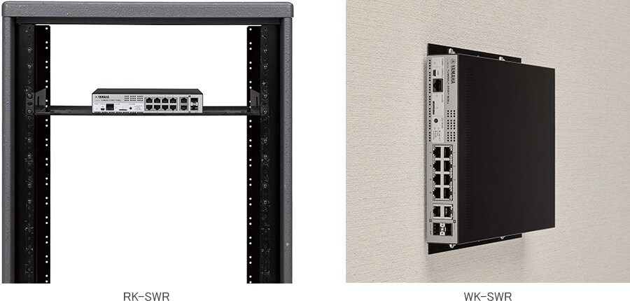 Дополнительные возможности установки обеспечивают отдельно предлагаемые корпус RK-SWR для установки в 19-дюймовую рековую стойку и настенный держатель WK-SWR для крепления устройства на стену (рекомендуем не устанавливать в положении, когда порты LAN повернуты вверх или вниз) или потолок на высоте до 2 м.