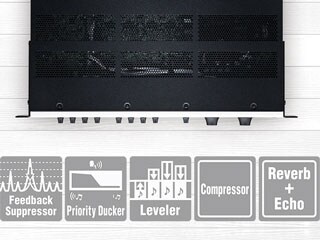 - Новейшие функции цифровой обработки сигналов для воспроизведения музыки и использования микрофонов: Feedback Suppressor (подавление обратной связи), Priority Ducker (автоматическое уменьшение громкости фоновой музыки), Leveler (выравнивание громкости сигналов).