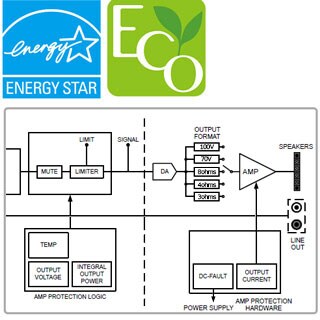 – Режимы можно соответствующим образом переключать для использования с акустическими системами с низким (3/4/8 Ом) или высоким импедансом (70/100 В).