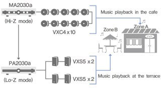 This figure shows a system that would be ideal for a restaurant with a bar and terrace area. The MA2120 is set to drive 100-volt lines, powering a total of 8 VXS3FT surface mount speakers via their 3.8W transformer taps, as well as 4 VXC3F ceiling speakers. The MA2120 can deliver different sources at different volumes in the respective zone. The PA2030a at 4Ω mode Lo-Z connection drives a total of 4 VXS5 surface mount speakers in parallel, delivering the same BGM at higher level.