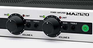 The MA2030a and MA2120 mixing power amplifiers offer flexible connectivity for a wide range of applications. The MA2030a comes equipped with two microphone inputs (XLR combo jack and Euroblock) and three stereo inputs (RCA pin). The XLR combo jack on the front panel makes setting up for speaking engagements fast and easy. The MA2120 includes six microphone/line inputs (Euroblock) and two stereo inputs (RCA pin, stereo mini phone). All six microphone inputs feature switchable 24V phantom power. Inputs 5 and 6 can also be used as MONO SUM inputs to provide extra input capacity.