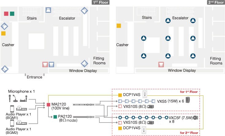 This figure shows a system of an apparel store with two floors, requiring different music at different output levels in each floor. The MA2120 is set to drive 100-volt lines, powering a total of 6 VXS5 surface mount speakers for 1st Floor and 8 VXC5F ceiling speakers for 2nd Floor. The additional PA2120 drives a VXS10S subwoofer for each floor, giving more comfortable bass to the music. The DCP1V4S controller panels allows volume control of each floor as well as mic on/off switching for store announcements.