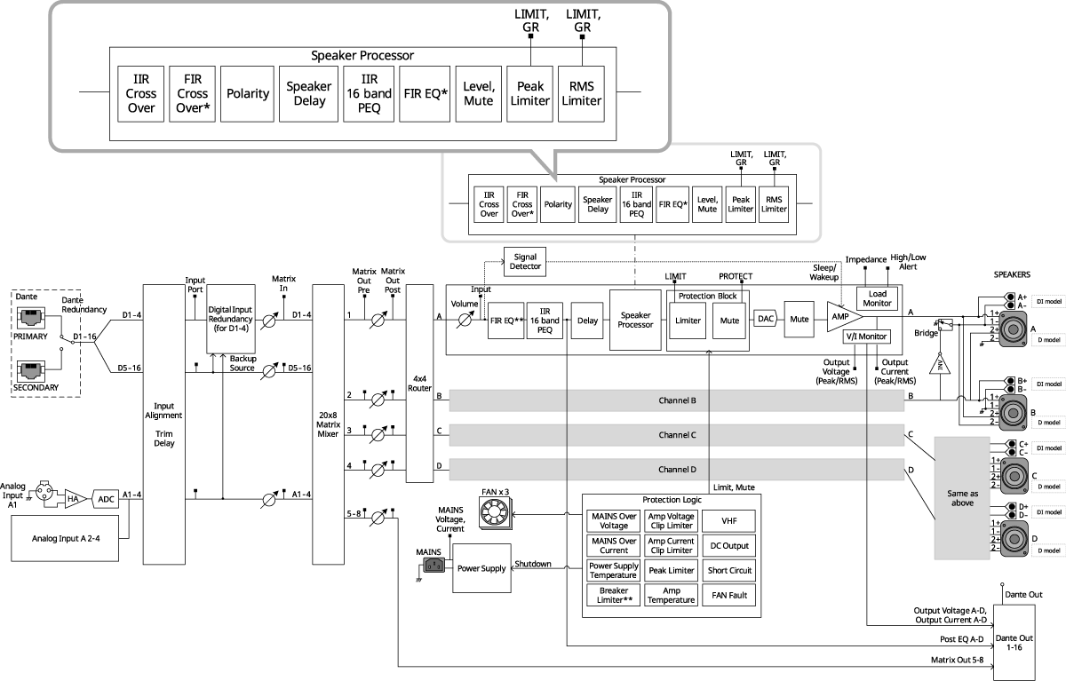 Усилители серии PC-D / DI в стандартной комплектации оснащены мощными встроенными процессорами для акустическим систем, поддерживающими такие функции как 16-полосной параметрический эквалайзер, дилэй, ограничение пиковой амплитуды и ограничение по среднеквадратичному значению уровня звука, а также КИХ-фильтр* с линейной фазовой характеристикой, что позволяет пользователям настраивать акустические системы легко и с идеальной точностью. Выходы Dante можно использовать для передачи на другие усилители дополнительных настроек параметров эквалайзера для калибровки под особенности помещения, чтобы централизованно регулировать эквализацию каналов нескольких усилителей. Библиотека пресетов для акустических систем содержит обширный набор оптимизированных пресетов для устройств Yamaha серии CZR и других устройств, с помощью которых можно с минимальными усилиями идеально настроить акустические системы в рамках конкретного решения.