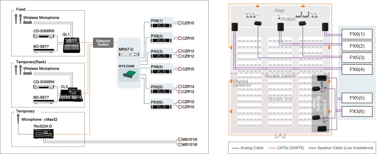 Цифровая сеть Dante поддерживает любые изменения и расширения системы передачи звуковых и управляющих данных. Новые устройства можно легко добавлять в сеть с помощью одного кабеля CAT5e и быстро настраивать с помощью программы MTX-MRX Editor. Сеть Dante обеспечивает превосходную гибкость в настройке системы, а также достаточные возможности для расширения в будущем.