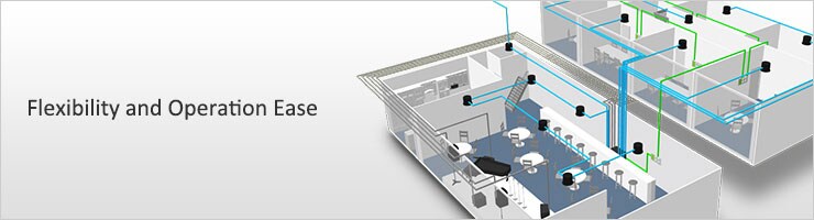 Цифровая сеть Dante поддерживает любые изменения и расширения системы передачи звуковых и управляющих данных. Новые устройства можно легко добавлять в сеть с помощью одного кабеля CAT5e и быстро настраивать с помощью программы MTX-MRX Editor. Сеть Dante обеспечивает превосходную гибкость в настройке системы, а также достаточные возможности для расширения в будущем.