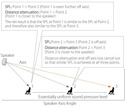 Однородный уровень звукового давления можно легко обеспечить на всей плоскости прослушивания, если сопоставить ось громкоговорителя с самой дальней целью (головой слушателя). Этот метод основан на отношении между расстоянием и углом покрытия. Если перпендикулярная ось сопоставлена с последним рядом слушателей, то естественное затухание на расстоянии, где находится последний ряд, и внеосевое затухание на более близких рядах, как правило, обеспечивает однородное распределение уровня звукового давления. В CISSCA можно точно настраивать угол подъема громкоговорителя с поверхностным монтажом для наибольшей гибкости при разработке системы.