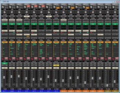The Overview display offers a convenient view of the mix parameters for 16 channels or buses at a time. Sends on Fader functionality is also available via the editor's Overview display.