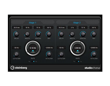 StudioChorus — это двухступенчатый хорусный эффект, который добавляет короткие задержки к сигналу и модулирует высоту тона задержанных сигналов, чтобы произвести эффект удвоения. Два отдельных этапа модуляции хоруса являются независимыми и обрабатываются последовательно (каскадно).