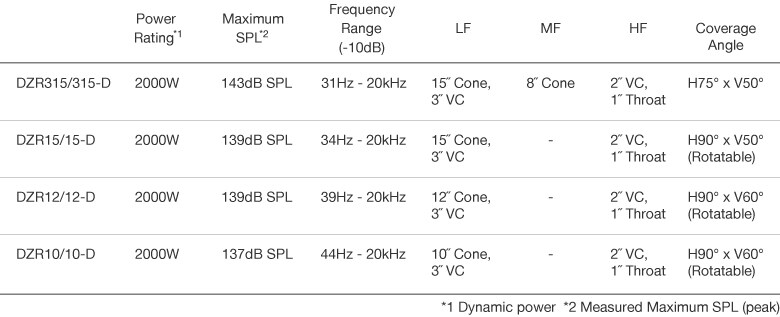 Новый высокоэффективный Class-D усилитель обеспечивает максимальную для устройств своего класса мощность — 2000 Вт, а также впечатляющий уровень звукового давления (SPL) 143 дБ. Все усилители были отобраны и оптимизированы для работы с ВЧ-, СЧ- (только модель DZR315) и НЧ-динамиками всех АС серии DZR. А для сабвуферов DXS XLF были разработаны специальные усилители.