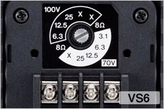 С помощью переключателя, расположенного на задней панели, можно выбирать напряжение 70 или 100 В для распределенной системы трансляции или в режиме 8Ом . Для изменения настройки переключатель следует повернуть при помощи отвертки. Терминалы подключения проводов и переключатель можно закрыть входящей в комплект крышкой.