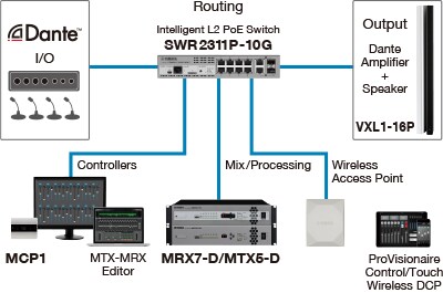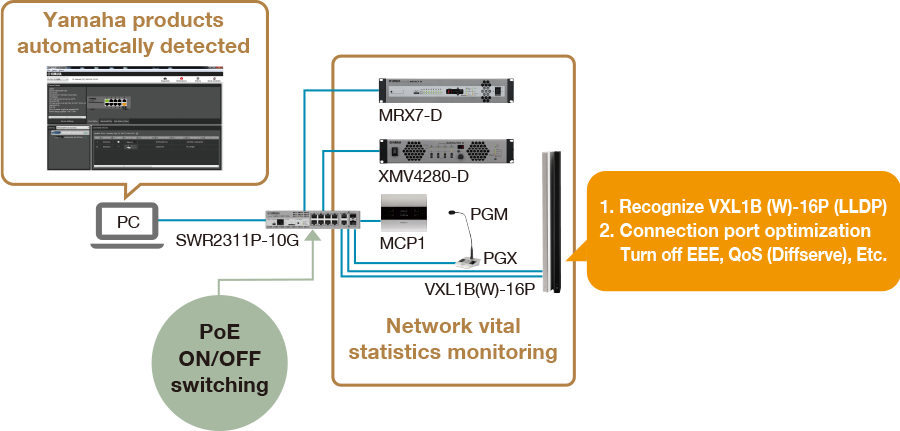 The "SWR2311P-10G" is an intelligent L2 switch that provides the ideal functionality for the "Dante" audio network, allowing construction of a stable network that simplifies settings, monitoring, management, and operation. When you connect the VXL1-16P to the SWR2311P-10G, optimal settings for Dante are made automatically via LLDP that is a protocol for passing system management data between a device and its neighboring device. PoE compliant ports can supply a maximum of 30W for all ports simultaneously.Using the dedicated "Yamaha LAN Monitor" software allows quick troubleshooting; you can check the PoE power supply status, turn the PoE power supply, and use the snapshot function to inform you whether a fault has occurred by detecting any difference in the state of the network since it was set up. The web GUI provides a full range of monitoring functionality, including dead/alive monitoring settings for PoE devices, allowing you to restart the PoE device if a fault occurs, or informing you via email of a fault. Using them with the "MRX7-D" Dante-network-enabled signal processor allows an intelligent conference room system to be constructed.