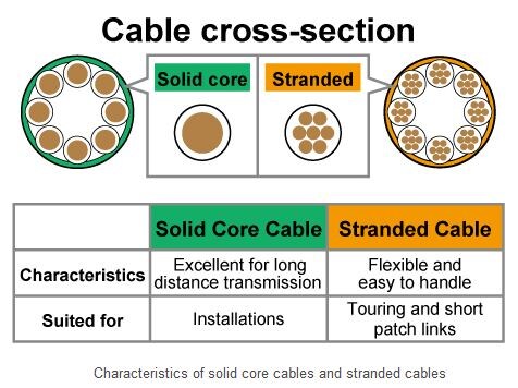 According to their specifications, CAT5e or higher cables can transmit data up to 100 m, but the actual potential transmission distance varies depending on factors such as the cable quality, the termination quality, and the environment in which the cable is used. Be sure to check the specifications provided by the cable manufacturer. Also, especially when installing connectors yourself, it’s important to note that when termination is not accurate, a cable will be unable to achieve its maximum transmission performance. If you are unsure of the long-distance transmission performance of a cable, you can use a cable checker to see whether the cable conforms to CAT5e (TIA/EIA-568-B). In addition to the categories discussed above, cables can be categorized into solid core cables and stranded cables according to the structure of the conductors within the cables. In a solid core cable, each of the eight conductors consists of a single copper wire, so solid core cables have better transmission performance over long distances than stranded cables. In a stranded cable, each conductor consists of stranded multiple copper wires, so stranded cables are more flexible and easier to handle than solid core cables. Therefore, in general, solid core cables are suited for installations, while stranded cables are suited for touring and short patch links. However, don’t expect all rugged CAT5e or CAT6 cables to provide stable 1Gbps performance at 100m lengths. If your touring cable needs to be longer than 70m, use either a rugged solid-core cable or fiber-optic cables for more stable performance.