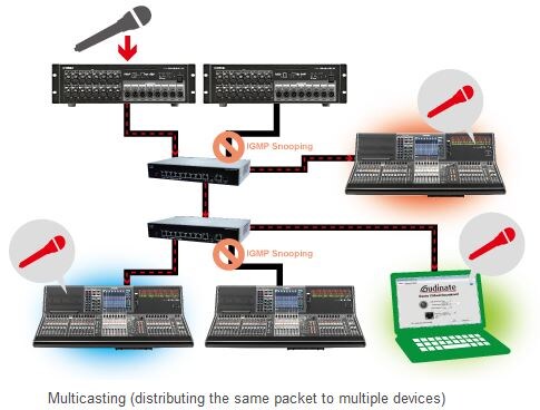 We strongly recommend that IGMP snooping is enabled if multicast is used. Even in that case, be careful to use a minimum amount of multicast. Dante configures routing with unicast by default, and multicast will not be required for most of small-to-mid scale Dante systems. To understand when the multicast settings of a switch need to be configured, it’s first necessary to understand multicast and "flows".