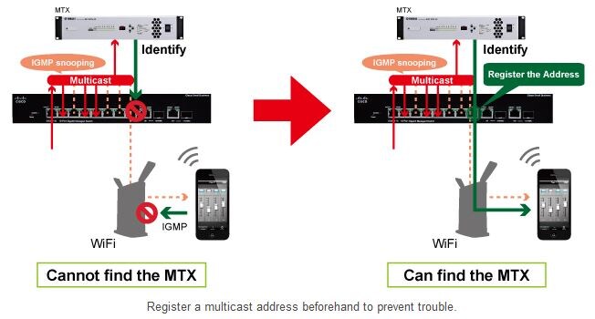 Finally, if Wi-Fi access is used within the Dante network (for example Wireless DCP iPhone app for an MTX/MRX Series matrix processor), we recommend that you register the multicast address used for detecting devices (multicast isn’t only used for audio transmission). When the network is accessed over Wi-Fi, it’s possible that IGMP messages will not be properly transferred via some types of access point. In that case, devices will not be detected through the access point because IGMP snooping will not be working properly. To prevent this from happening, you should register the corresponding multicast address beforehand in order to detect devices reliably. Apply the setting only to the switches that access points will be connected to by following the procedure below.