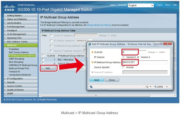 You can register a multicast address in the following page. Click “Add” to open a dialog box. Select the appropriate VLAN ID (in this example, we are assuming that VLAN 2 is for Dante), set IP Multicast Group Address to “224.0.0.251”, and click “Apply”.