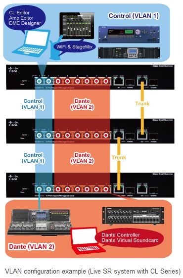 Here, we will present an example in which two VLANs are created and the switches are connected by a trunk. For example, in a live system using a CL/QL Series console, VLAN 1 (ports 1 and 2) could be used as the control network and VLAN 2 (ports 3 to 8) could be used as the Dante network.