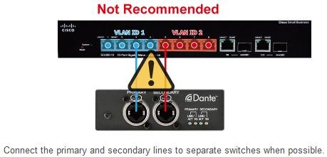 You can use network segmentation to connect the primary and secondary Dante lines to the same switch, but we recommend that you avoid doing this, because while connecting the lines to the same switch may provide the redundancy necessary for handling cable problems and other issues, if the switch malfunctions, both lines will be cut off.
