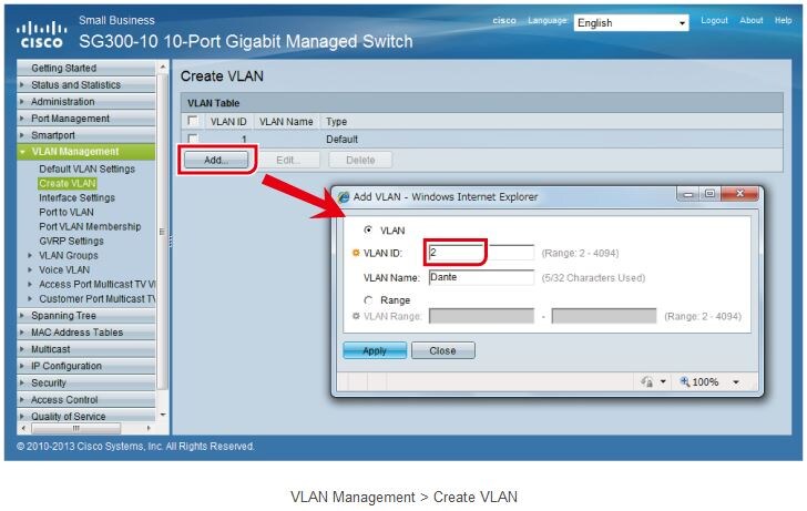 First, create the necessary VLAN. In the default settings, only VLAN 1 exists, so add VLAN 2. In the following page, click “Add”. In the VLAN ID box in the dialog box that appears, type “2”, and click “Apply”. When you are creating multiple VLANs, entering a VLAN name can help you identify each individual VLAN (but you do not have to enter a name).