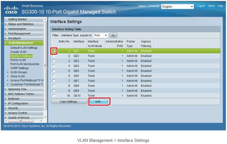 Next, you will need to set the VLAN mode for each switch port. By default, each port is a trunk port, so you will have to change ports 1 to 8 to access ports. In the following page, select port 1, and then click “Edit”.