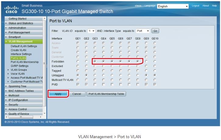 Next, assign each port to one of the VLANs. In the following page, you can specify which ports are allowed to access each VLAN. First, make sure that VLAN ID is set to “1” and Interface Type is set to “Port”. Ports 3 to 8 will not be included in VLAN 1, so set them to “Forbidden”. Ports 9 and 10 are the trunk ports, but VLAN 1 includes special default VLAN settings, so leave them set to “Untagged”. Before you switch to the settings for VLAN 2, don’t forget to click “Apply”.