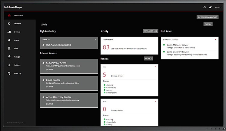 Next, the DDM server administrator can enrol ‘users’ and assign roles (i.e. which functionality a user can access) and domains to each user. This way the whole network can be managed - Dante Controller users only see and have access to the devices and functions they are authorised for by the system administrator. A user can see his or her assigned domains only after logging in to the server with a user name and password. Also, additional information and monitoring is available through a simple ‘dashboard’ web interface that can be accessed through a web browser such as Chrome or Safari.