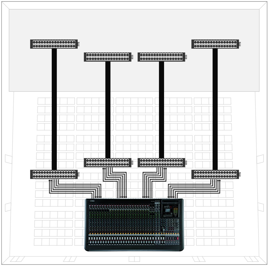 Dante позволяет использовать вместо тяжеловесных, дорогостоящих аналоговых или многожильных кабелей сетевой кабель, например, CAT5e или CAT6.