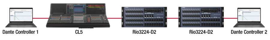 Модули Dante в устройствах серий CL, QL и R, а также некоторые другие устройства оснащены внутренним коммутатором, с помощью которого можно организовать последовательное подключение. Хотя устройства физически соединены последовательно, используется логическая топология типа «звезда».